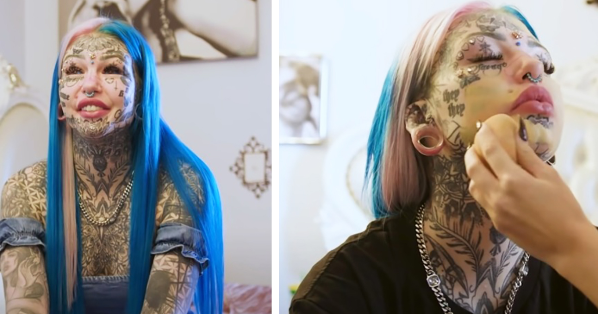 In a unique experiment, Amber concealed the tattoos on her face with foundation and replaced her distinctive eye color with lenses.