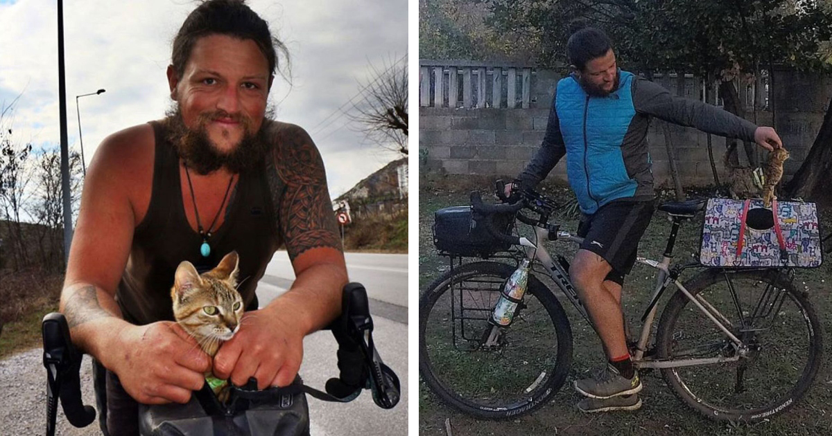 The man decides to cycle around the world solo, but the stray cat becomes his best companion